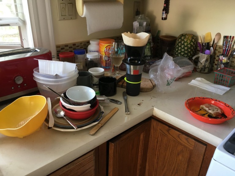 First thing for me, I notice small, dark puddle on the kitchen counter near the fridge. I delay my breakfast, figure it out, and restore the universe to its proper order. I am not pleased to begin my day this way. Culprit is a leaky old can of Coca Cola up in the most distant part of the cupboard above the refrigerator.